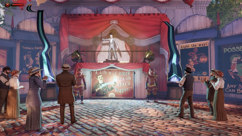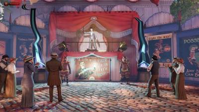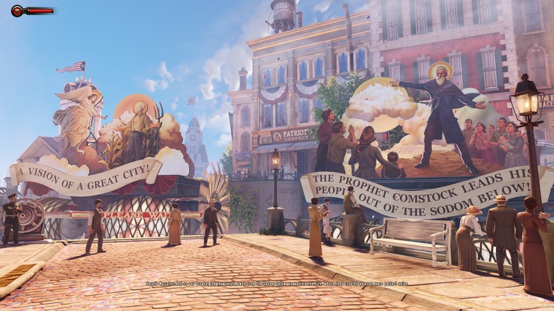 Высокий возрастной ценз игра заслужила не только за сцены насилия, но и за поднятые авторами темы. На сей раз, помимо классовой борьбы, BioShock затронула сегрегацию и слепое поклонение религиозным идолам. Колумбия лишь с виду райское место. Под яркими открыточными пейзажами скрывается гнилое полицейское государство. Его правитель Комсток, «великий пророк» и «отец-основатель», создал вокруг себя культ, переписав ради этого страницы новейшей истории. Здешняя элита, лениво загорающая на искусственном пляже, ничего, кроме омерзения не вызывает – расизм и ксенофобию тут прививают с младых ногтей. Впрочем, подобно пропагандистской машине Колумбии, вдалбливающей слоганы про бдительность и патриотический долг, сценаристы учат уму-разуму не очень тонко, да ещё и по обкатанной схеме. После тура по кварталам, где живут сливки общества, Букера отправят в трущобы и фабричный комплекс — там тысячи рабочих за гроши куют чужое буржуазное счастье. Но если в BioShock мы наблюдали последствия междоусобной войны, то здесь увидим полный цикл революции, от первых всплесков недовольства до мостовой, заваленной трупами.